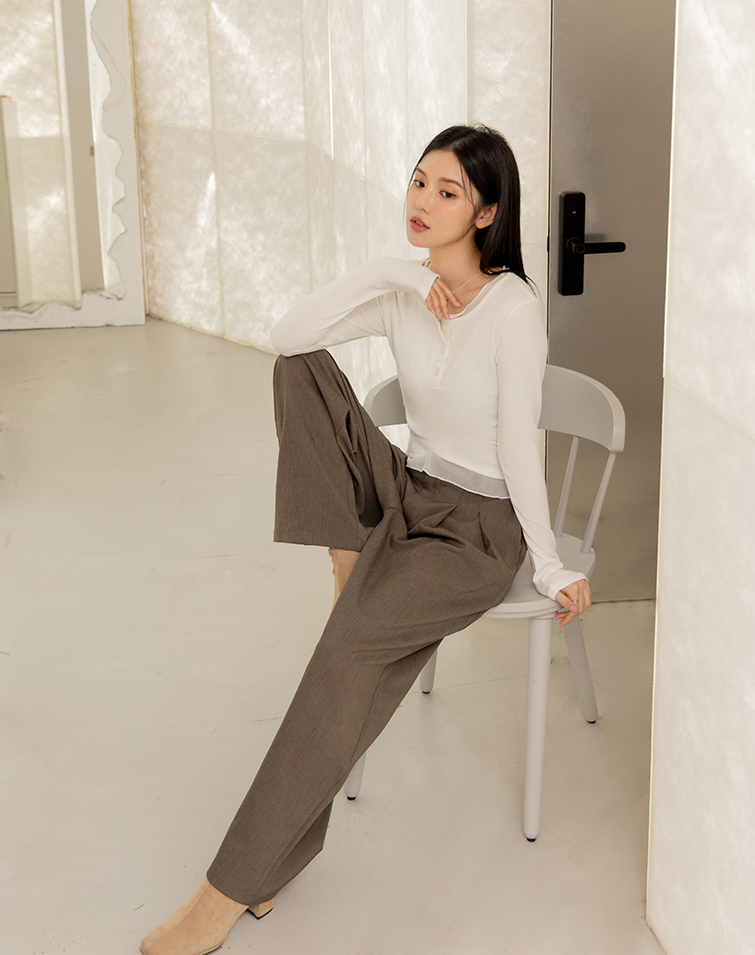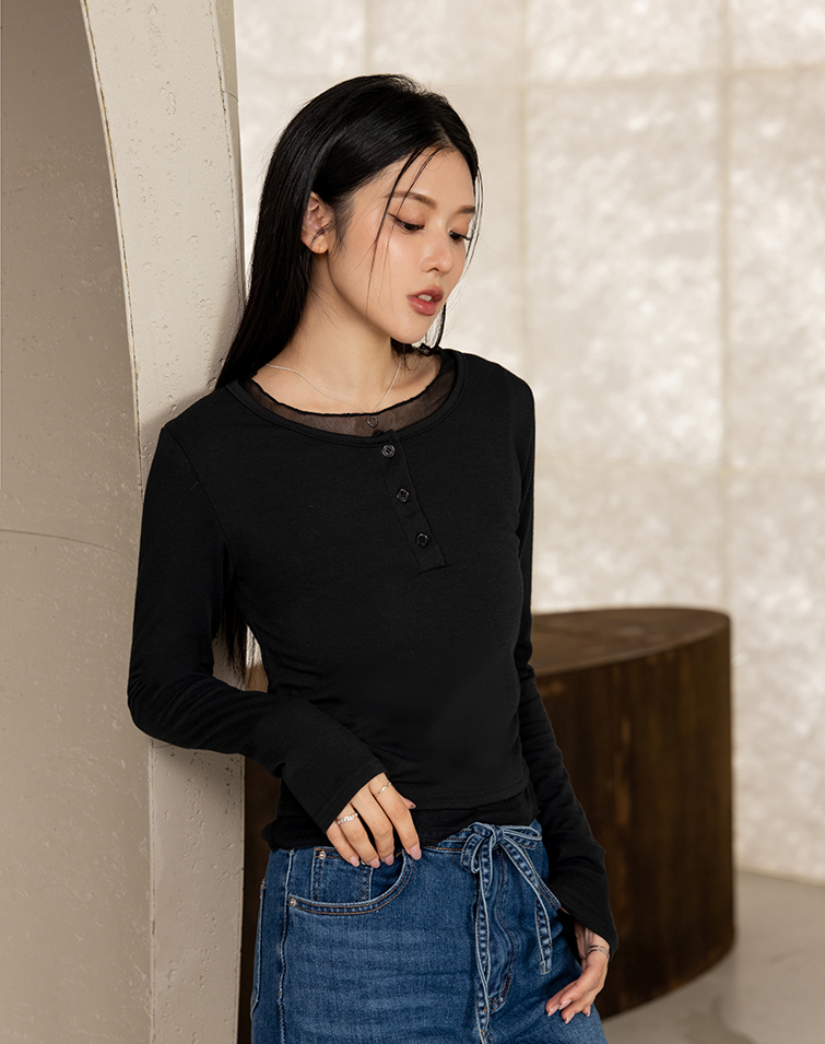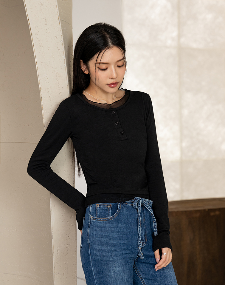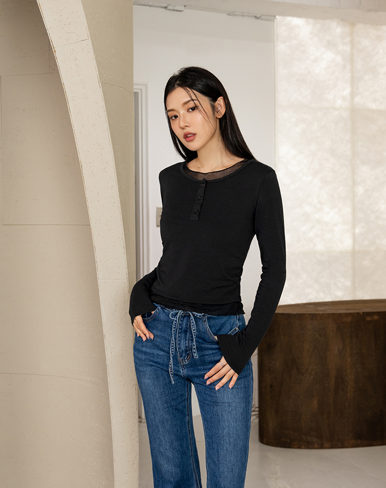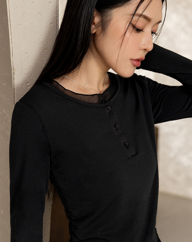 Delicate mesh panels / Button placket / Side ruching
