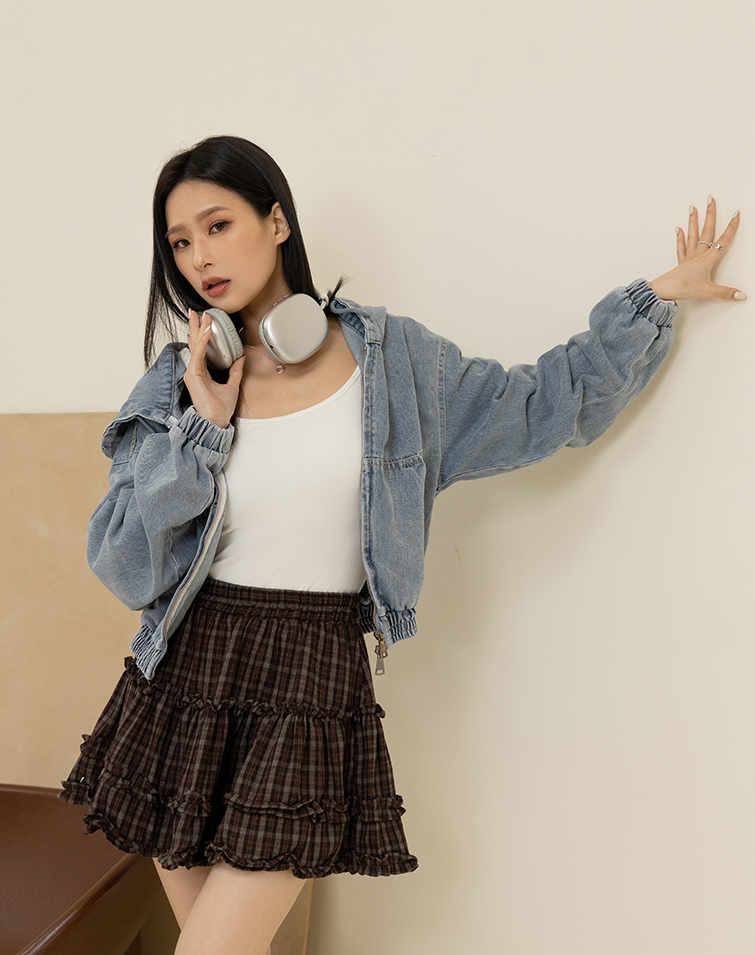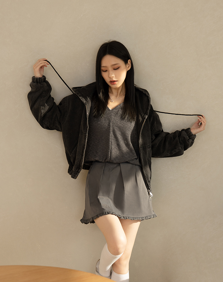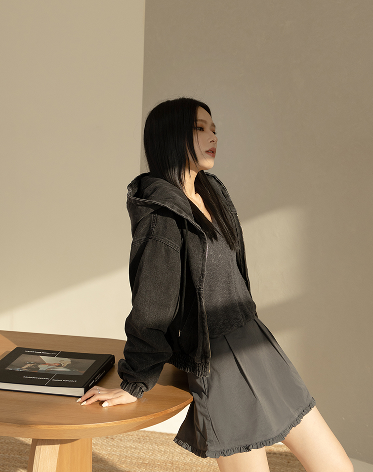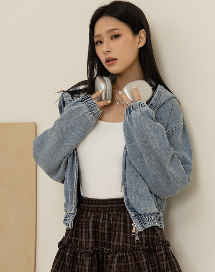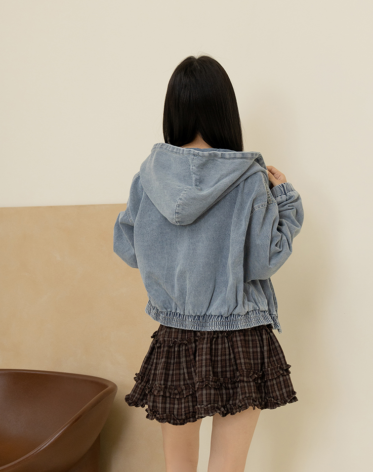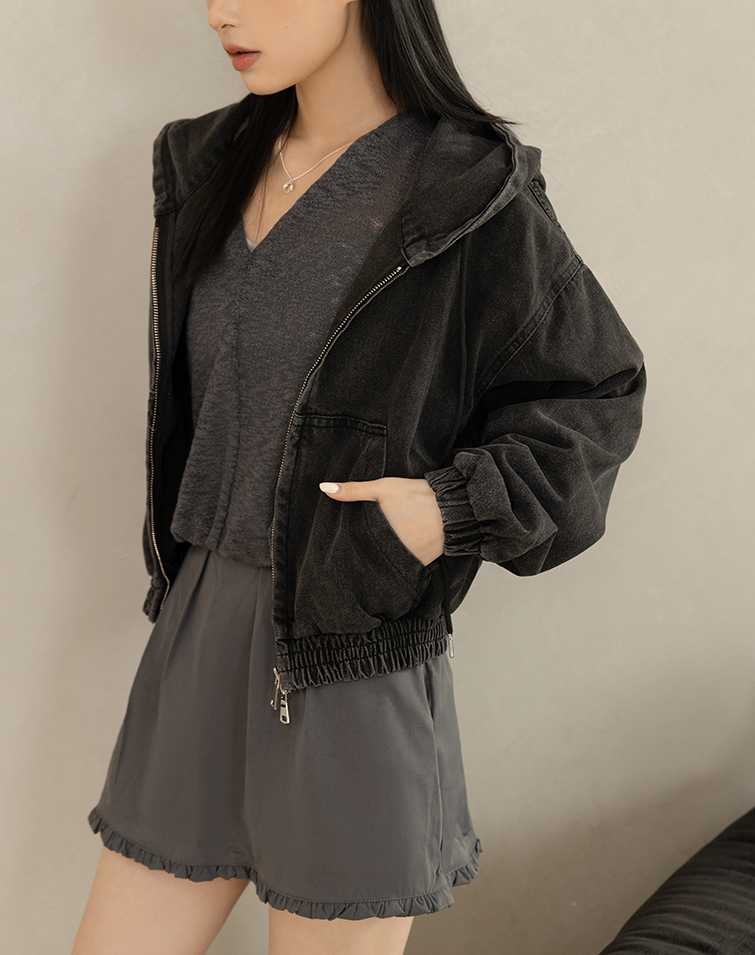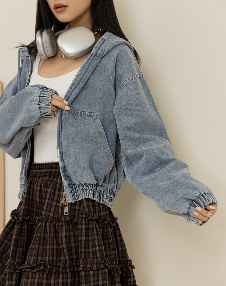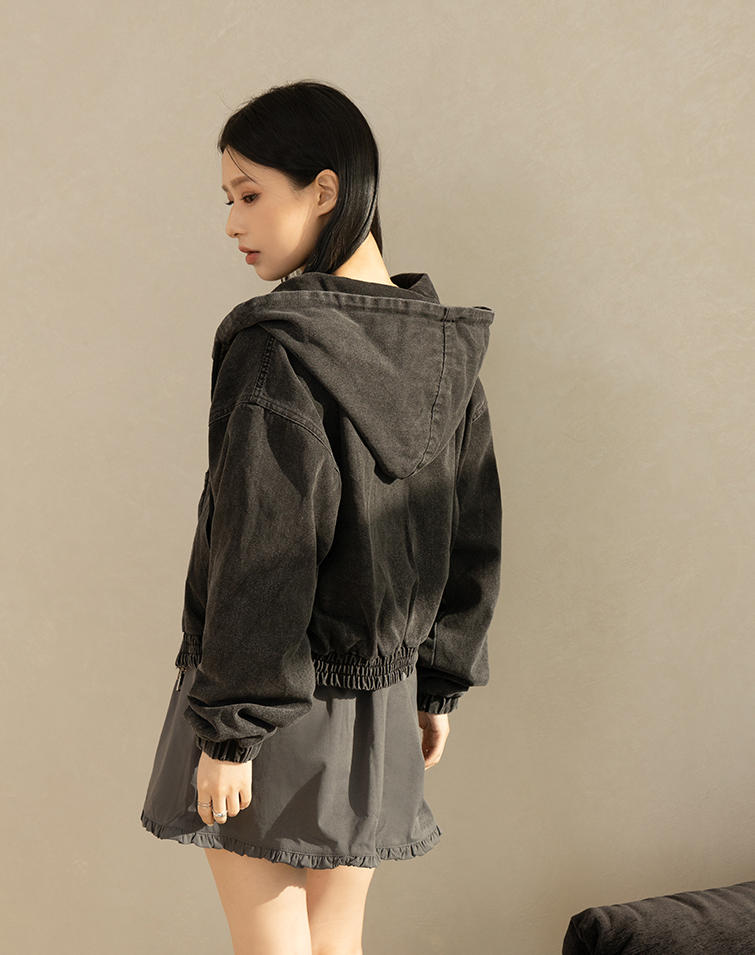 WASHED DRAWSTRING HOODED DENIM JACKET