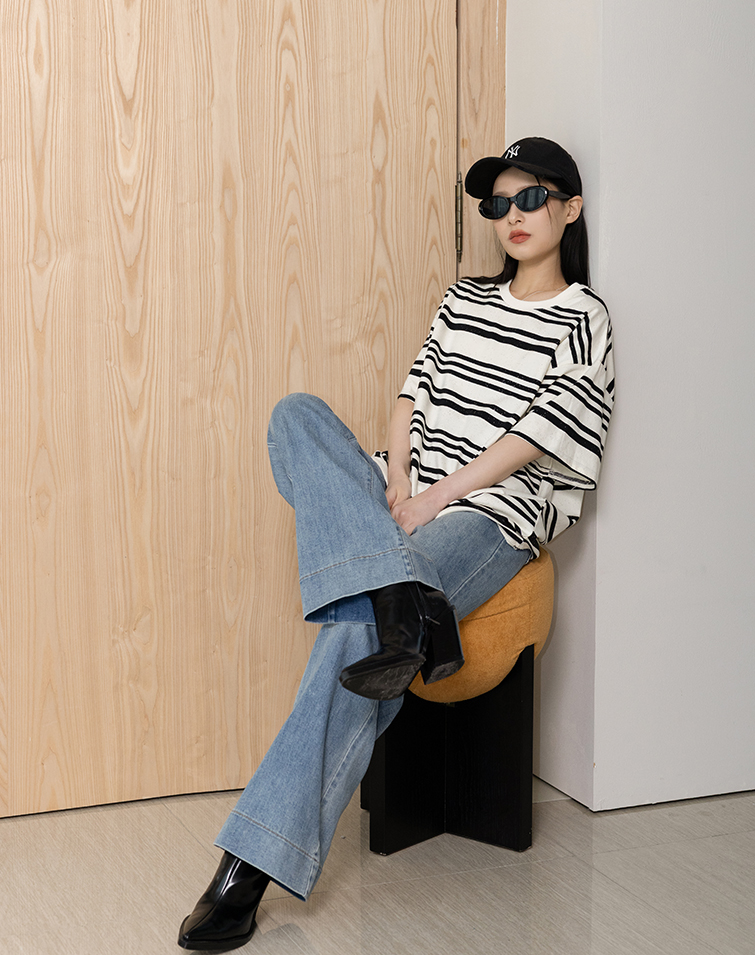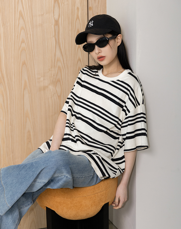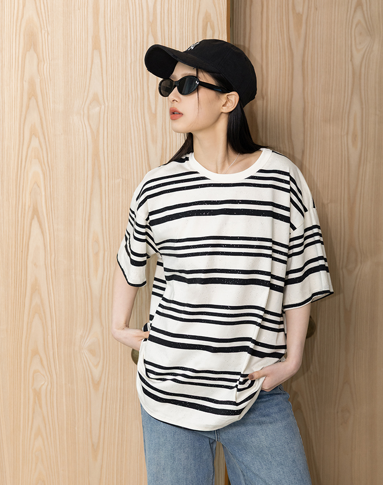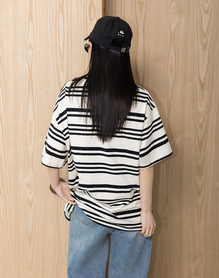 Loose / Unique sparkle detailing / Slimming horizontal stripes
