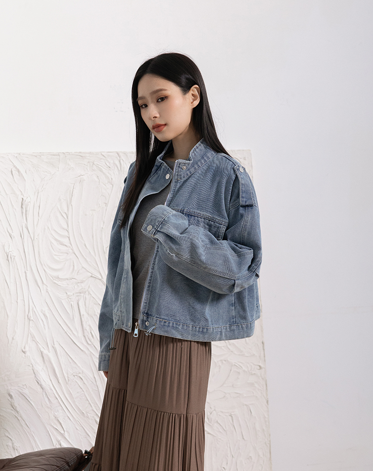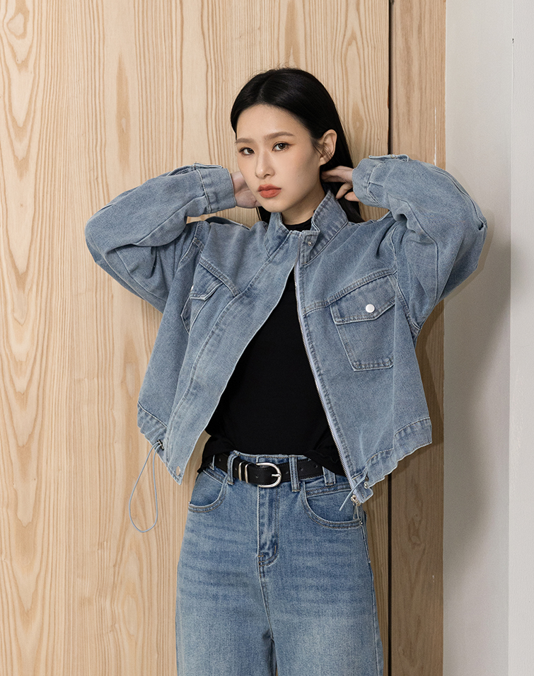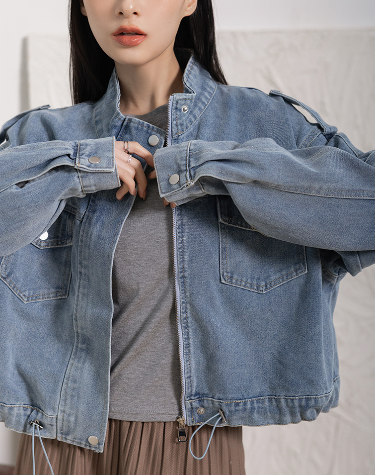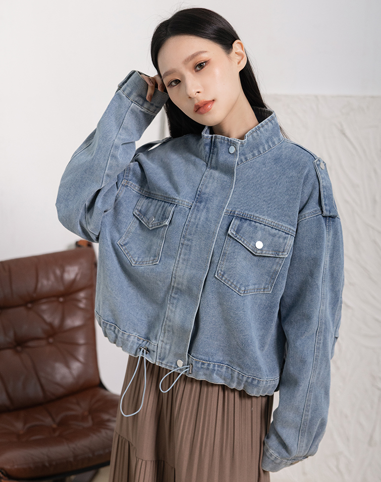 DRAWSTRING WAIST STAND-COLLAR DENIM JACKET