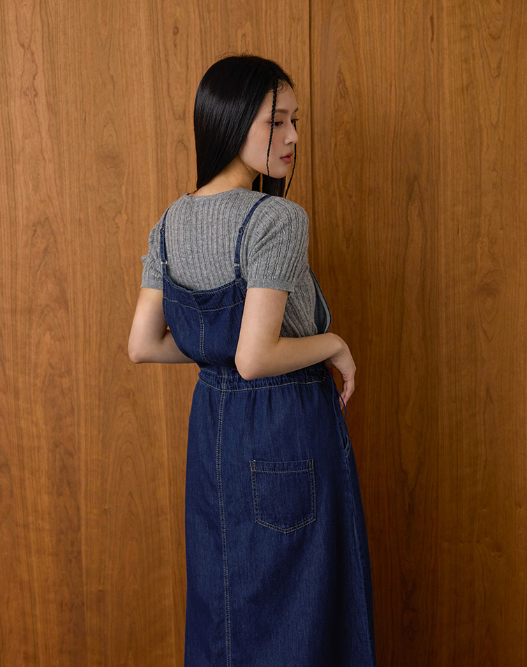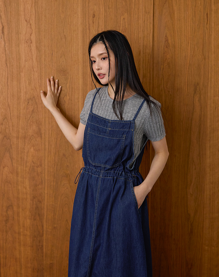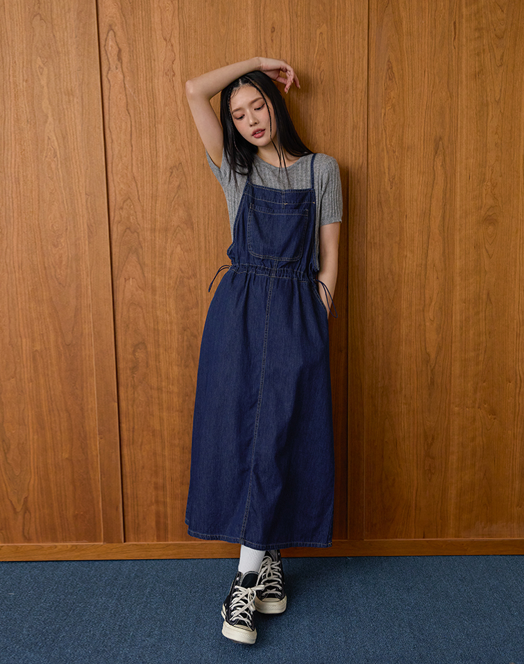 POCKET-STYLE WAIST-TIE DENIM SUSPENDER DRESS