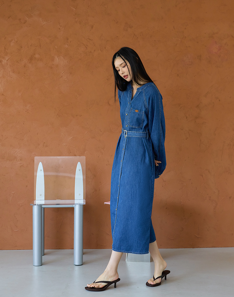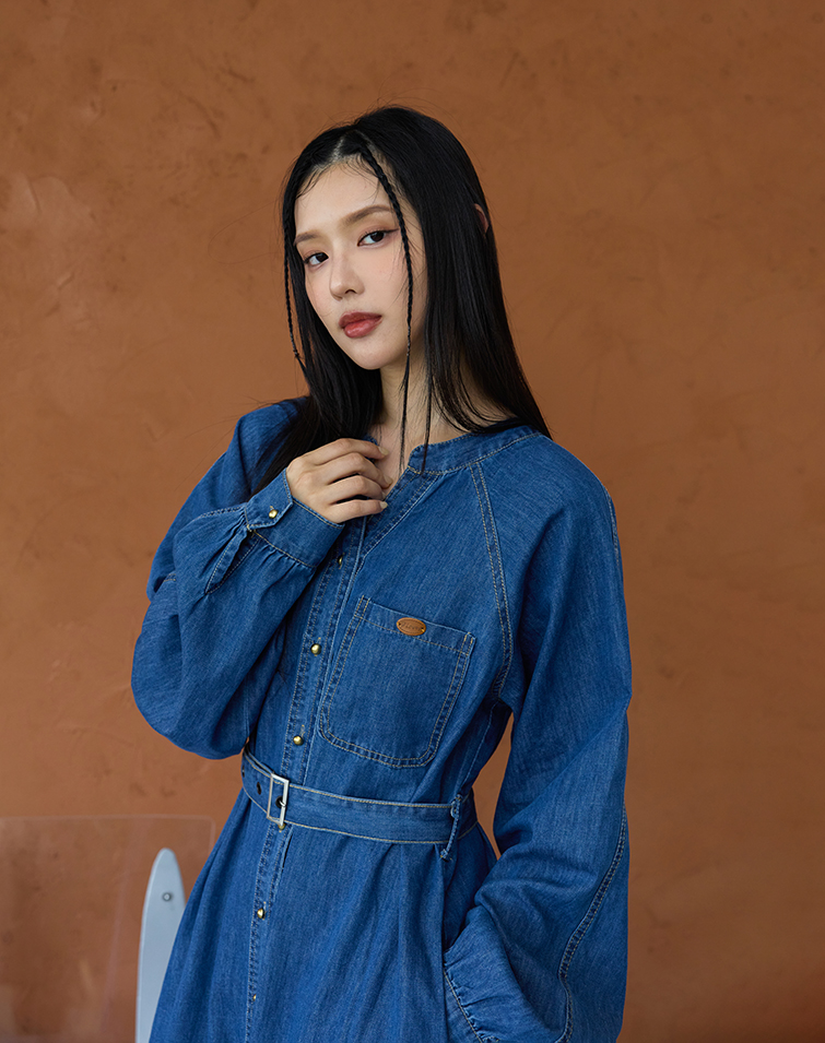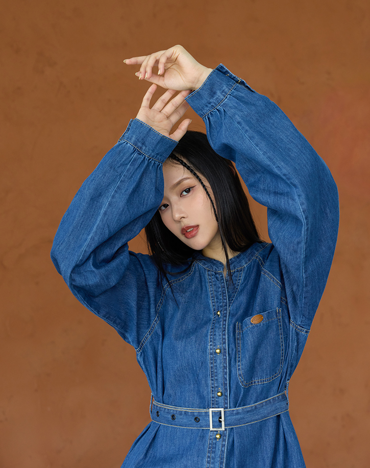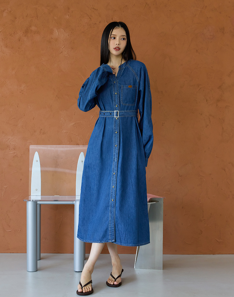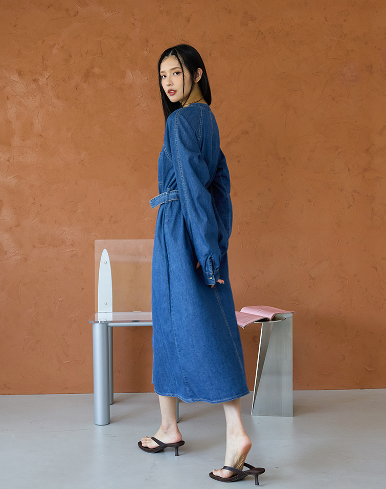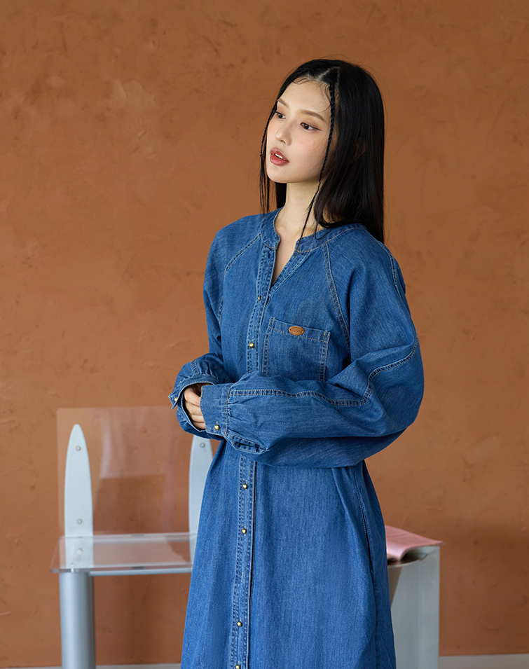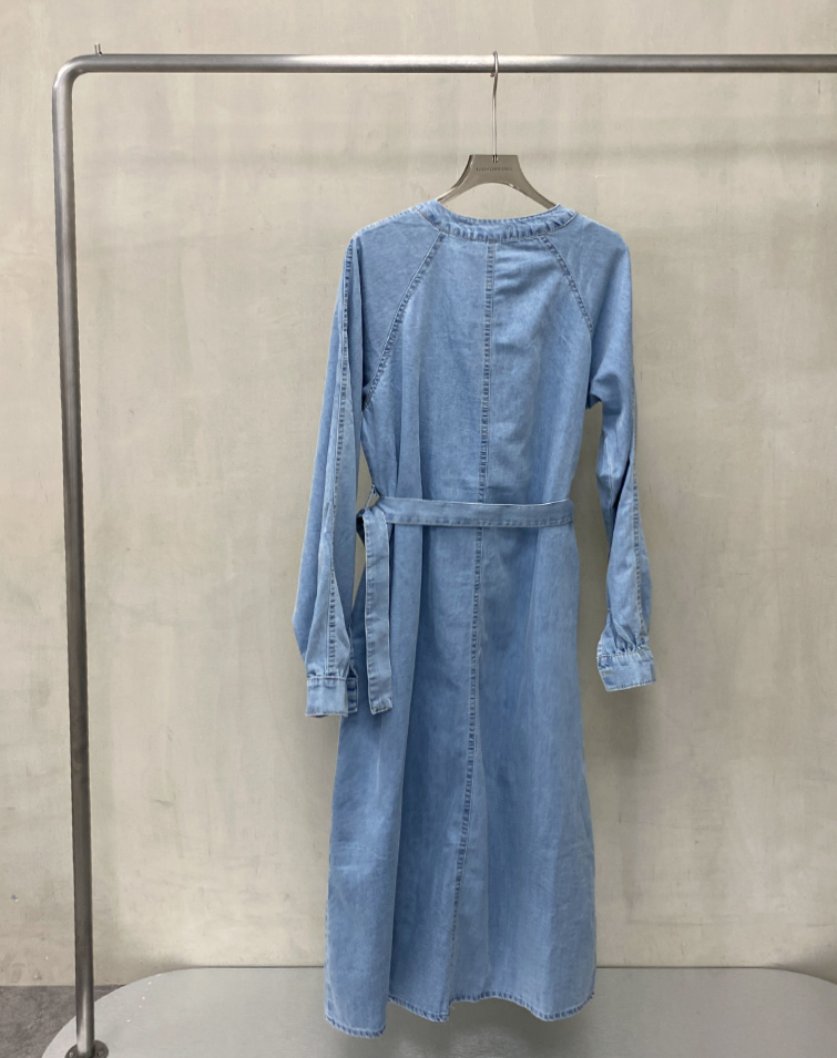 WASHED DENIM LONG-SLEEVE DRESS WITH GOLD BUTTONS