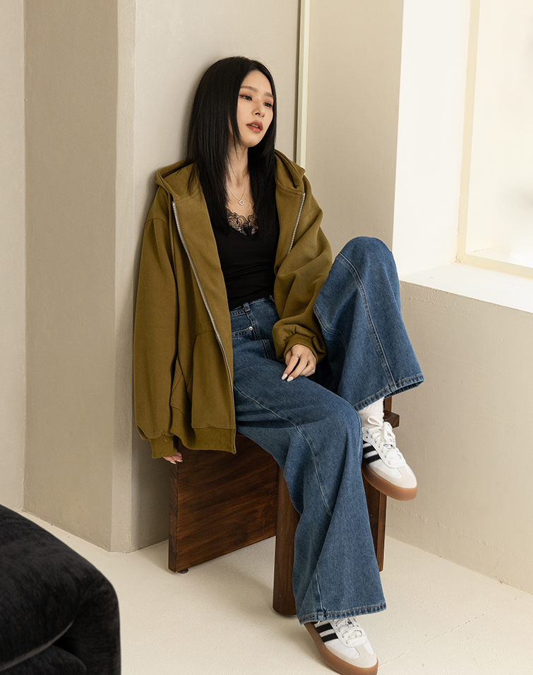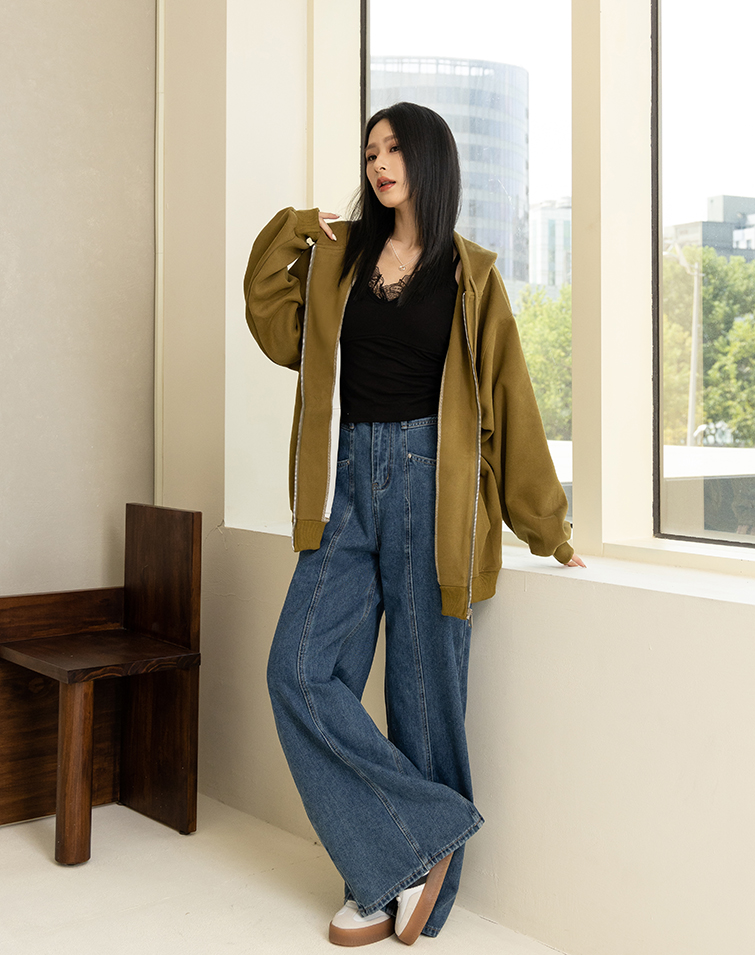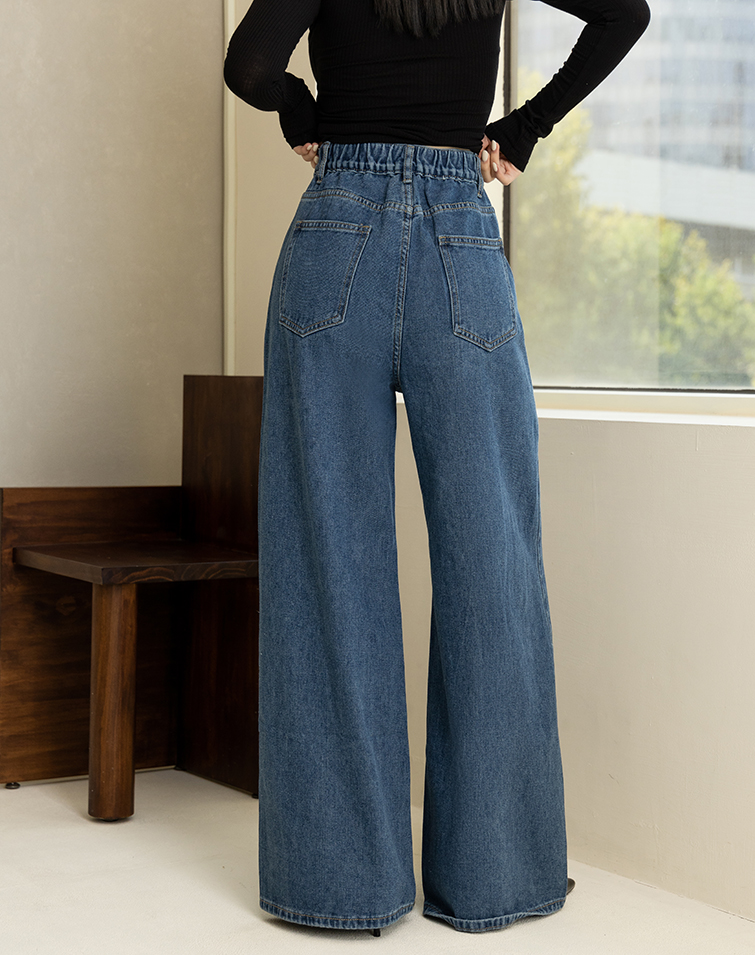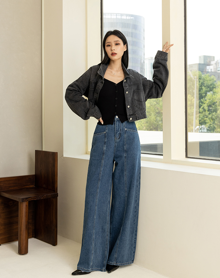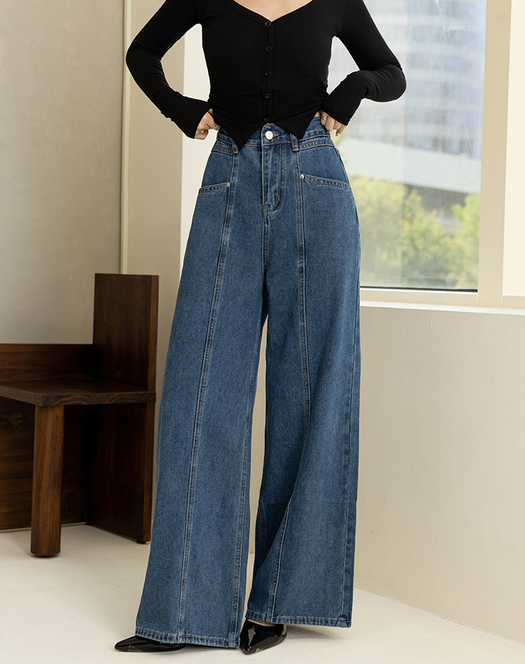 VINTAGE STITCHED DESIGN DENIM WIDE-LEG PANTS