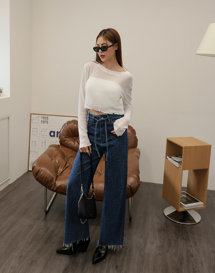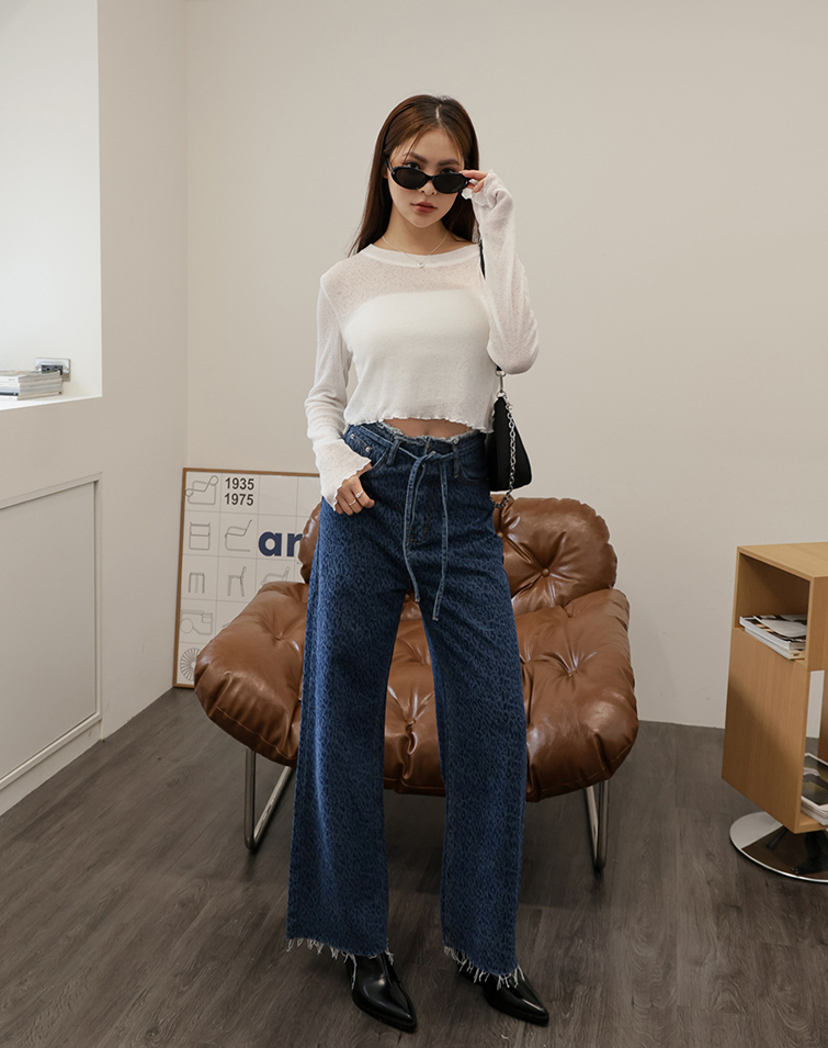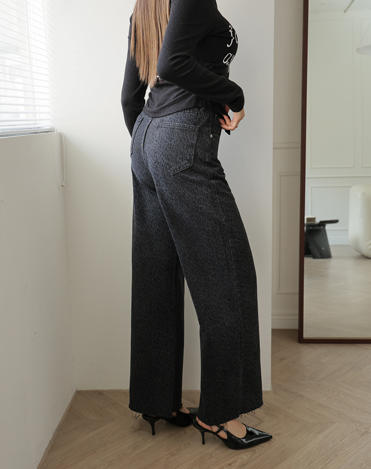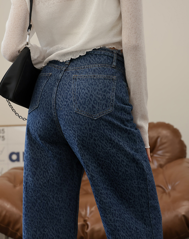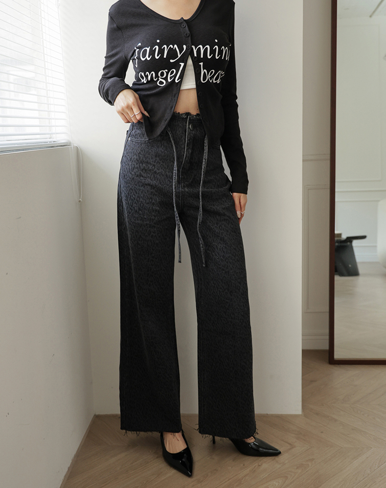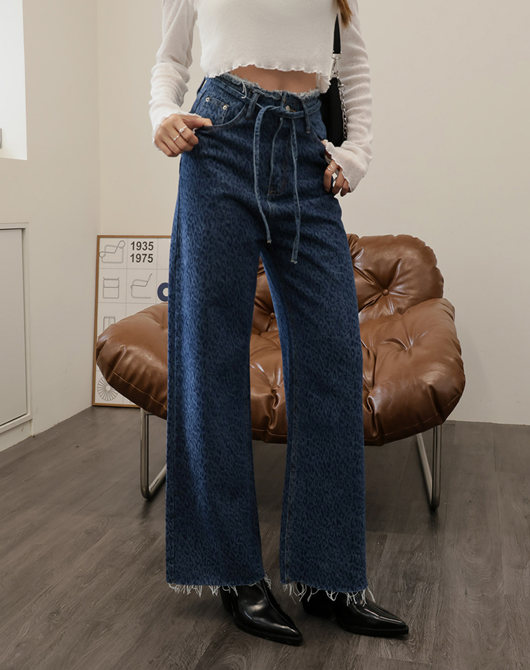 DRAWSTRING DENIM LEOPARD PRINT JEANS