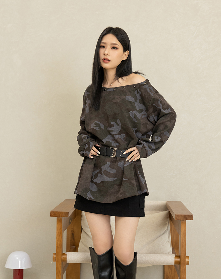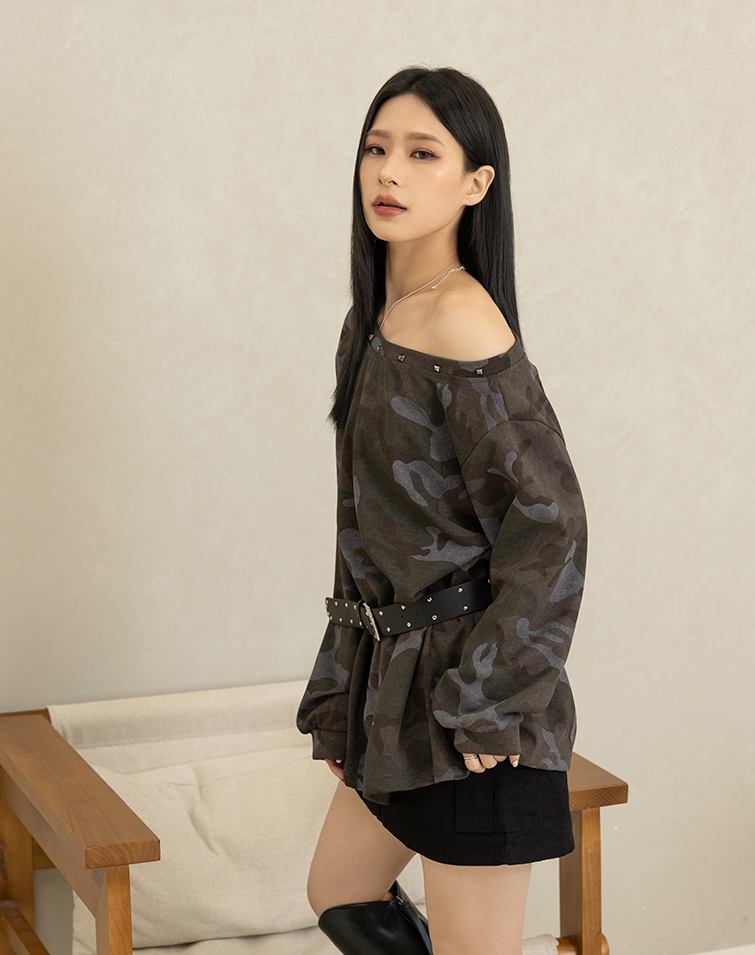 CAMO STUDDED LONG-SLEEVE TOP WITH BELT